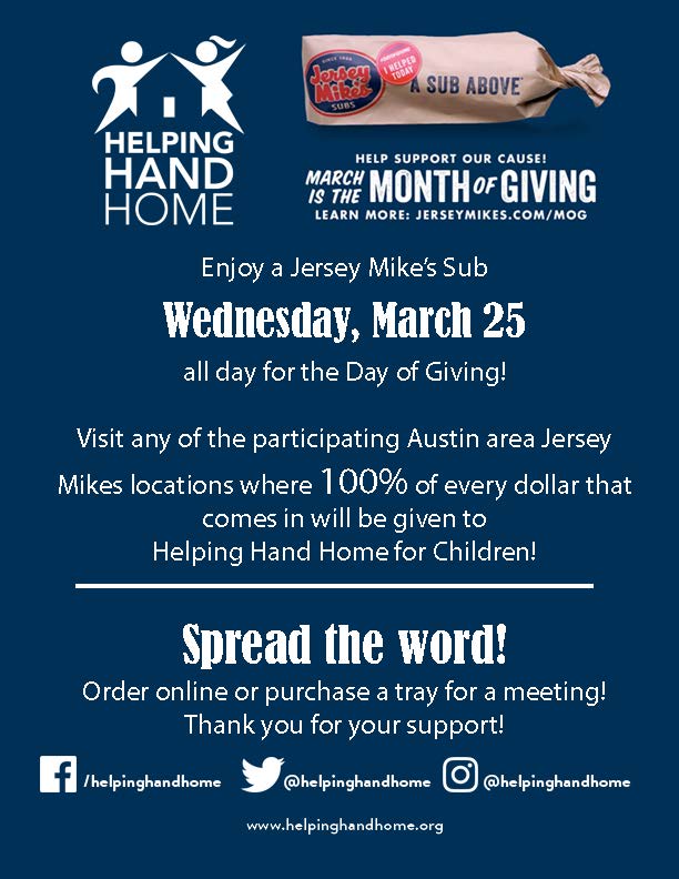Visit any participating Austin area Jersey Mikes location where 100% of every dollar that comes in will be given to Helping Hand Home for Children!